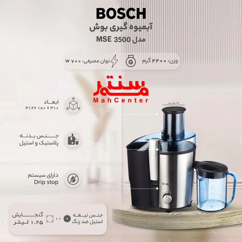 برای خرید آبمیوهگیری بوش مدل MES3500 و تجربه کیفیت بینظیر این محصول، پیشنهاد ما به شما فروشگاه اینترنتی مه سنتر است. مه سنتر با ارائه محصولات متنوع و باکیفیت، امکان خرید آسان و مطمئن را برای شما فراهم میکند. با انتخاب مه سنتر، این آبمیوهگیری کارآمد را به آشپزخانه خود اضافه کنید و از نوشیدن آبمیوههای تازه و طبیعی لذت ببرید.
