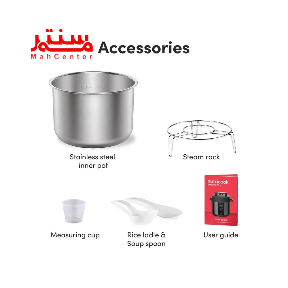 - لوازم جانبی کامل: شامل پیمانه مدرج، کفگیر برنج، ملاقه سوپ و پایه بخارپز؛ همه چیز برای شروع سریع آماده است.
